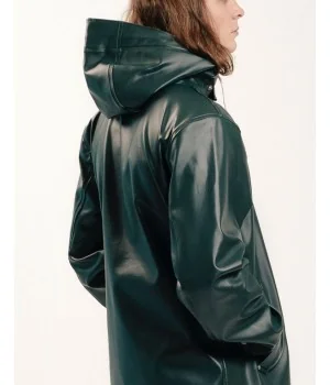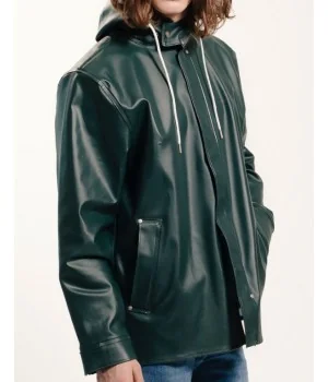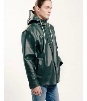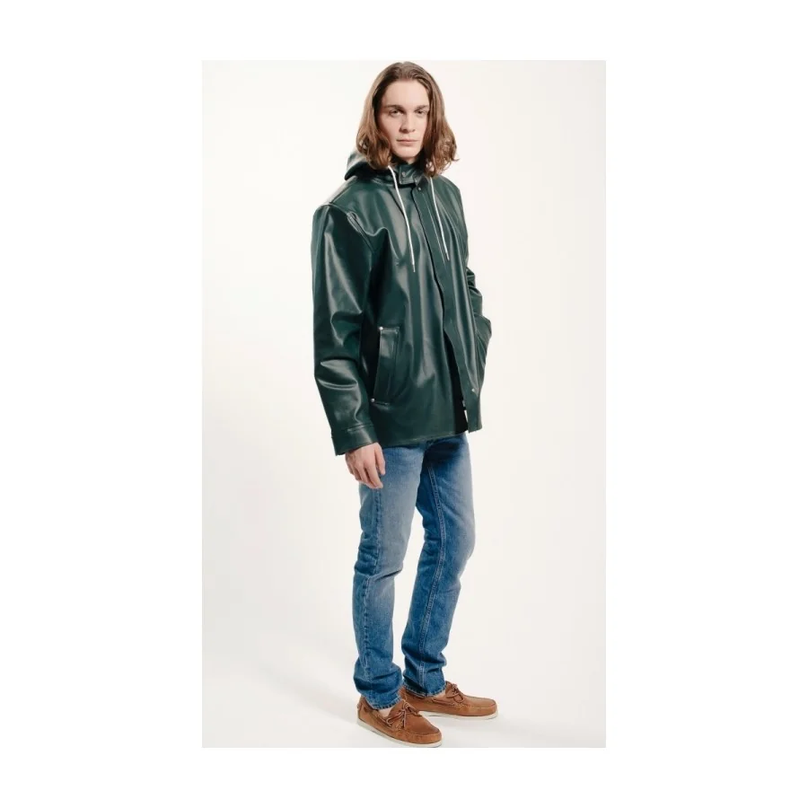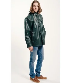 GRUNDÉNS “Brigg 310 Originals” rain jacket, which has welded seams, adjustable hood with drawstring, double-buttoned front with hidden snap buttons, adjustable cuff with velvet lining and snap button adjustment.